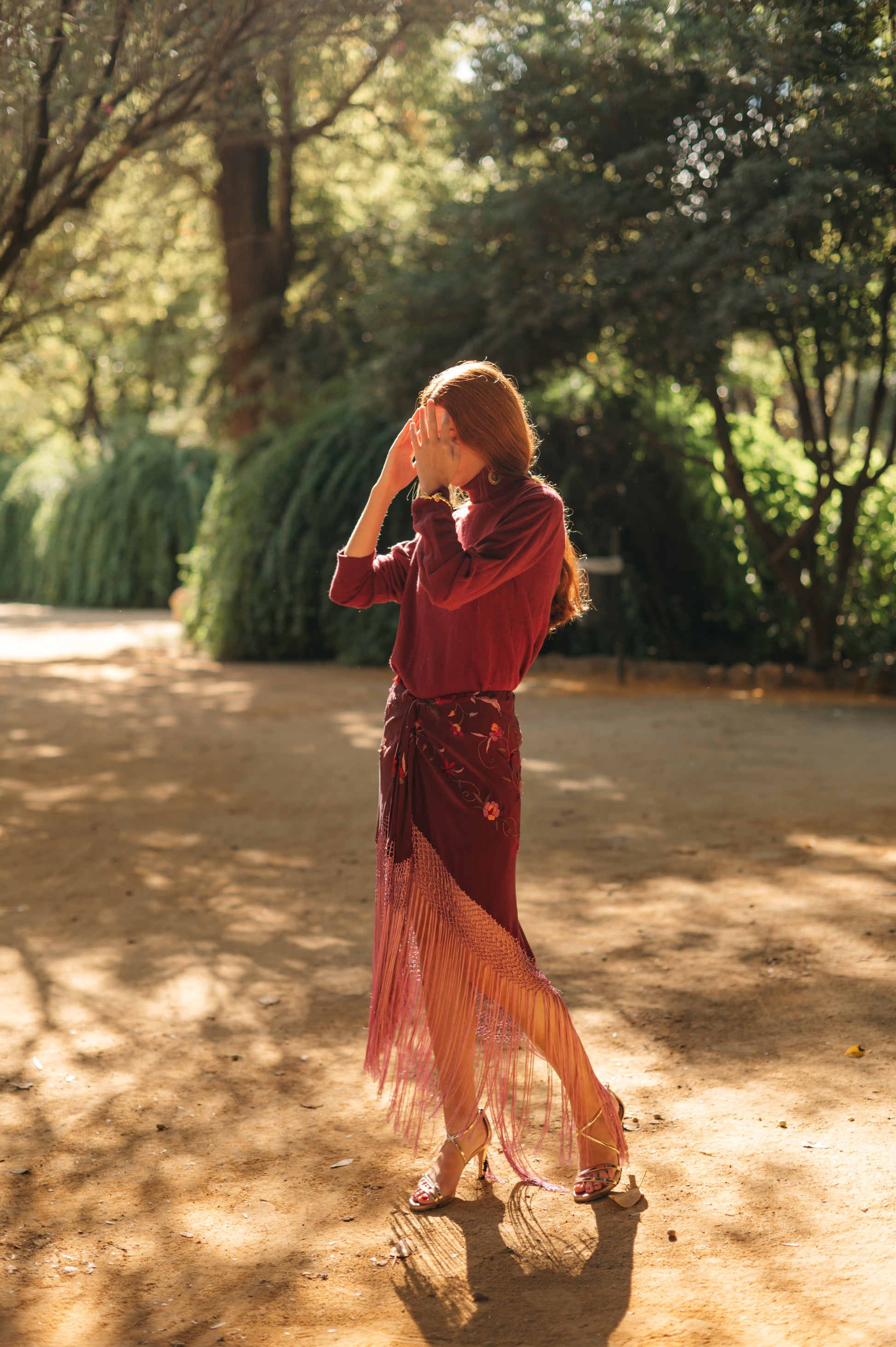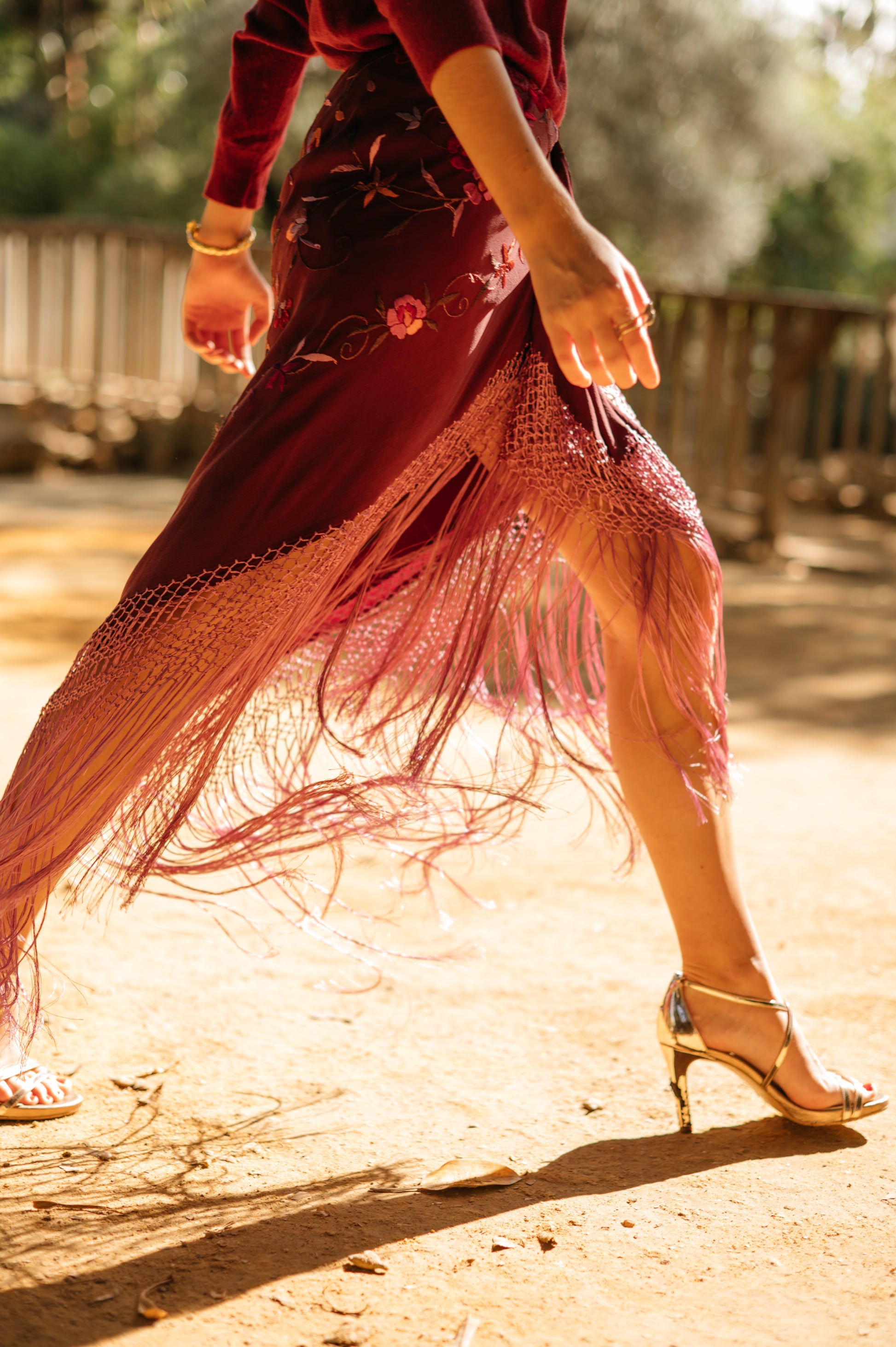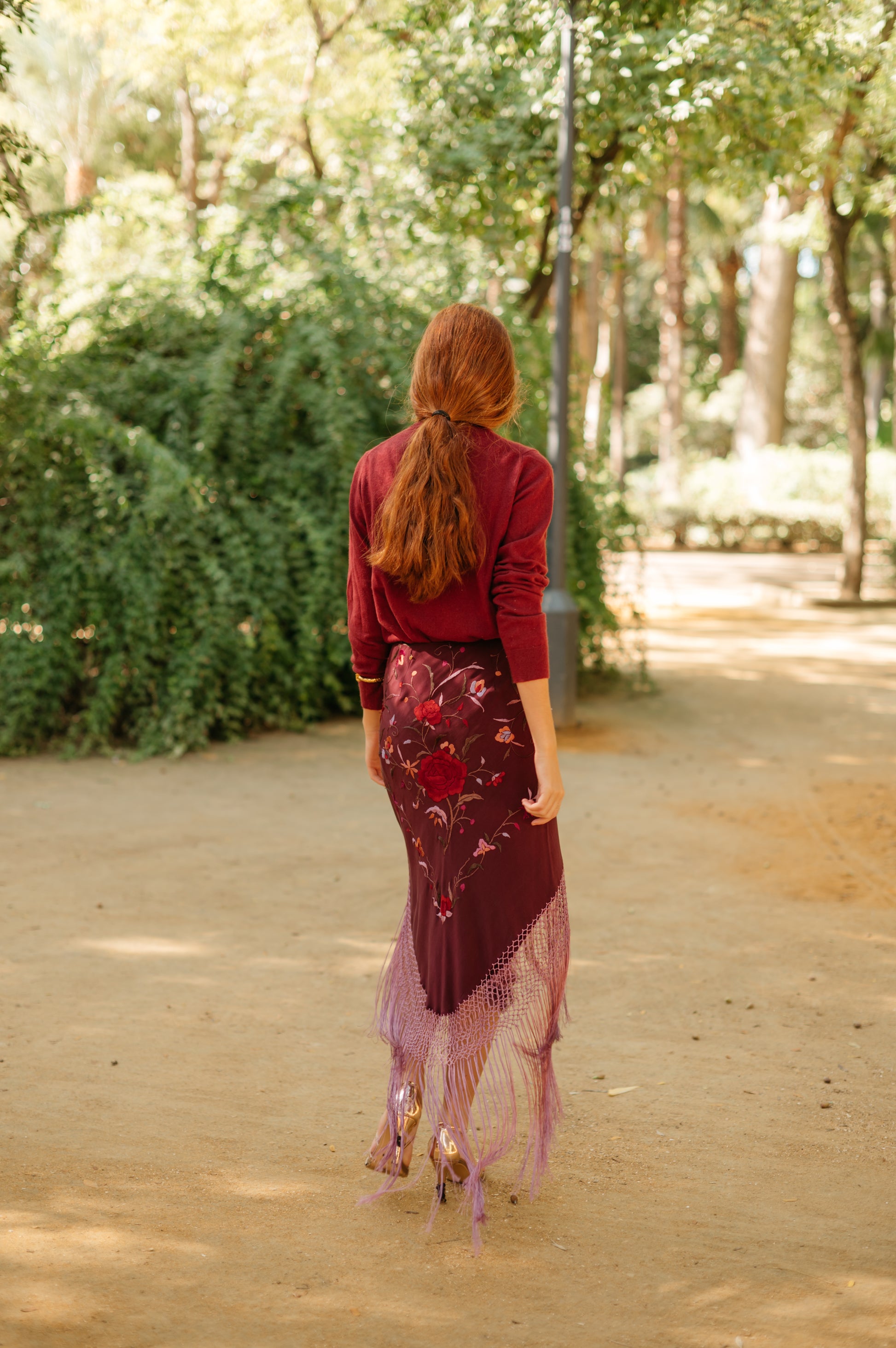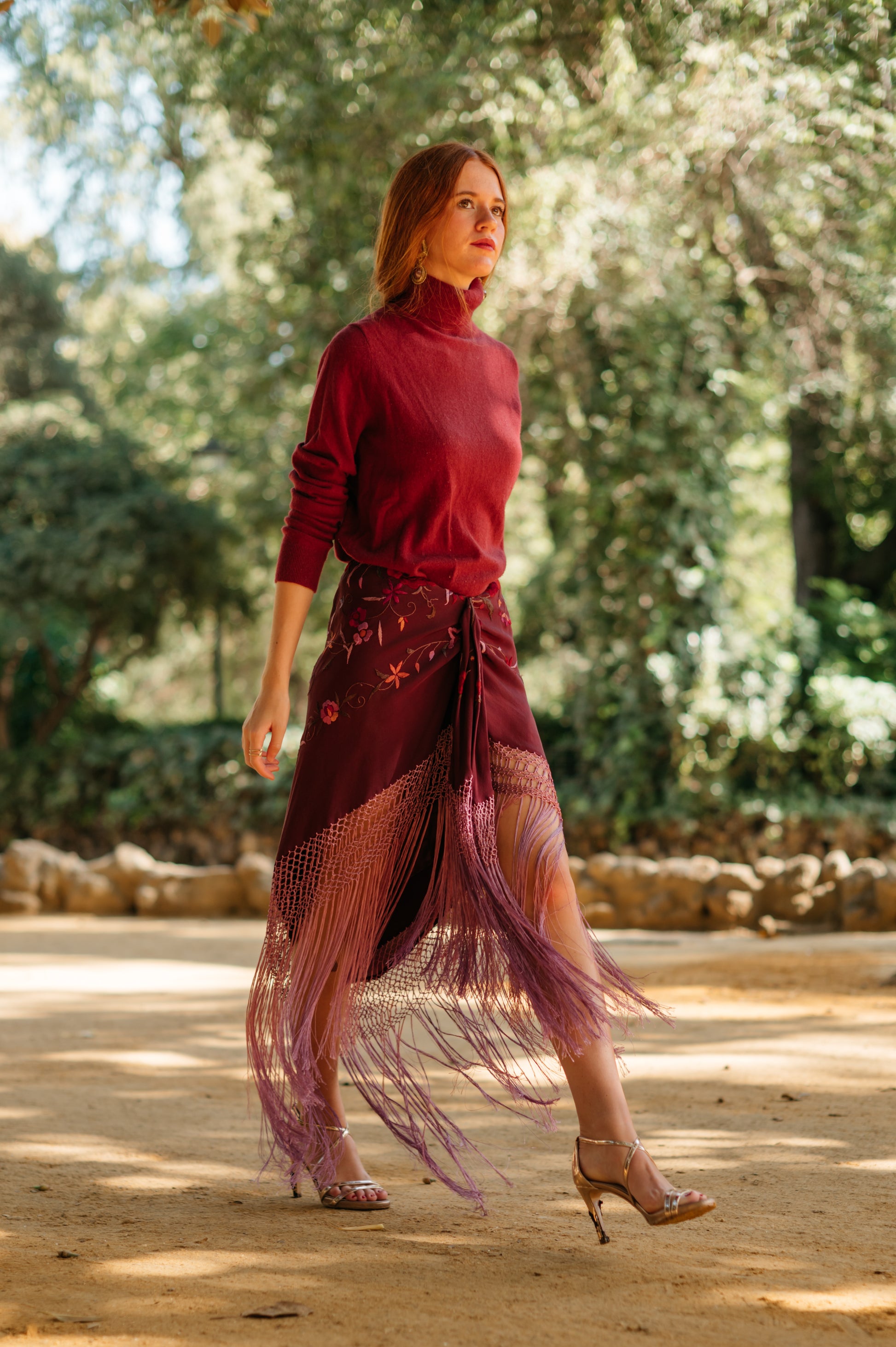 Falda pareo confeccionada con mantón de Manila bordado y flecado a mano, en seda color granate con flores de colores y flecos a tono. Se cierra con cremallera y corchete.
