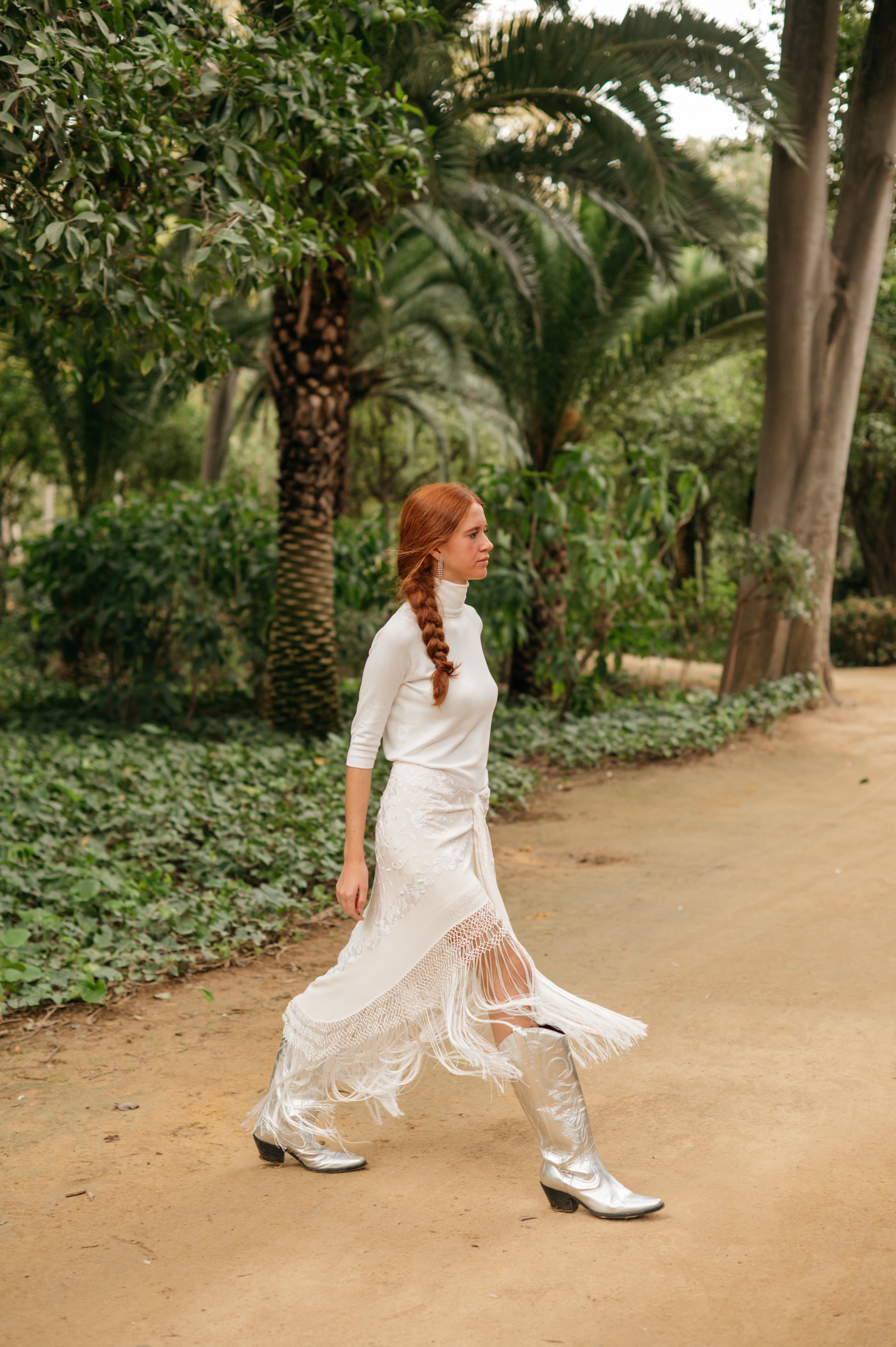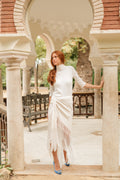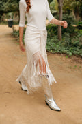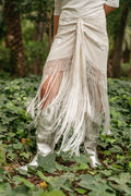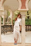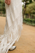 Falda pareo confeccionada con mantón de Manila bordado y flecado a mano, en seda color marfil con flores y flecos a tono. Se cierra con cremallera y corchete.
