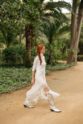 Los tonalidades beige y crema siempre son un acierto para acudir a un evento de día, un bautizo, una comunión ¡o incluso como segundo vestido de novia! Nuestra Jupe Un Dimache está profusamente bordada en seda, a mano y tiene un flecado espectacular. ¡Es la favorita para llegar al altar!