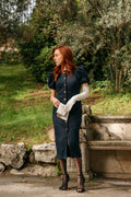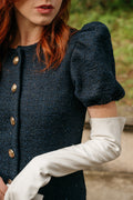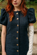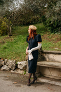 Navy blue tweed dungarees with a slightly fitted leg and a flared silhouette. Adjustable straps at the back. The model is wearing a size XS and is 1.68m tall. In the photo, she's wearing Mary Janes with a 3cm heel.
