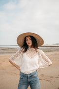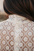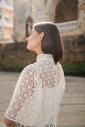 Camisa de estilo victoriano en encaje marfil, con mangas cortas y amplias y cuello subido. Botones de estilo antiguo.