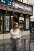 Una falda muy versátil que podrás lucir tanto de día como de noche. Su color gris plata con un bordado ligeramente satinado resulta muy elegante y sofisticado. La Jupe Argentée combina muy bien con camisas blancas y complementos plata.