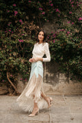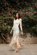 Una falda pareo confeccionada con mantón de Manila bordado y flecado a mano, en seda verde agua con flores y flecos oro. Se cierra con cremallera y corchete.
