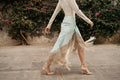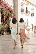 Sus colores empolvados enamoran para lucir en una boda de día, en la playa, o en la Feria. El contraste con oro siempre resulta muy elegante y podrás combinar así los accesorios. Junto con la Jupe Rosé es una de nuestras faldas estrella.