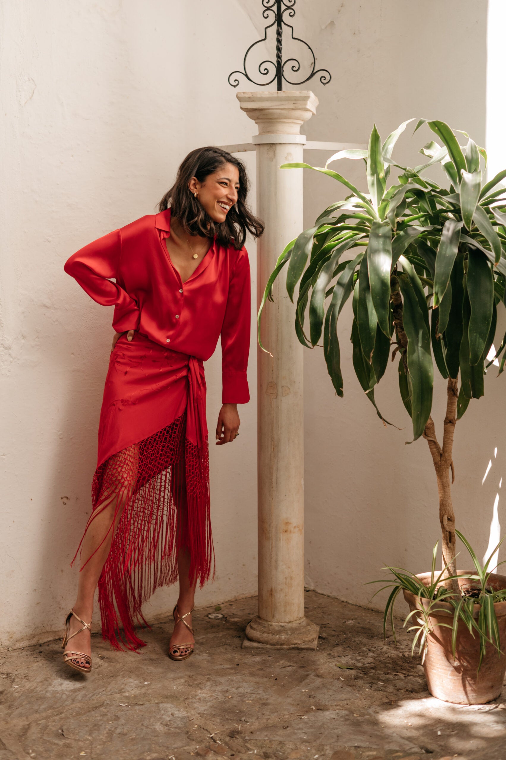Nuestras faldas confeccionadas con mantones de Manila son un icono de la casa. En ROOM 717 reivindicamos este producto tan nuestro, el mantón de Manila, y lo llevamos a un terreno más actual y contemporáneo convirtiendo esta pieza de seda bordada y flecada a mano, en una falda pareo que puedes lucir en multitud de ocasiones, más allá de Ferias y eventos.
