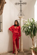 Falda pareo confeccionada con mantón de Manila bordado y flecado a mano, en seda roja con flores y flecos a tono. Se cierra con cremallera y corchete.