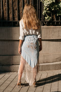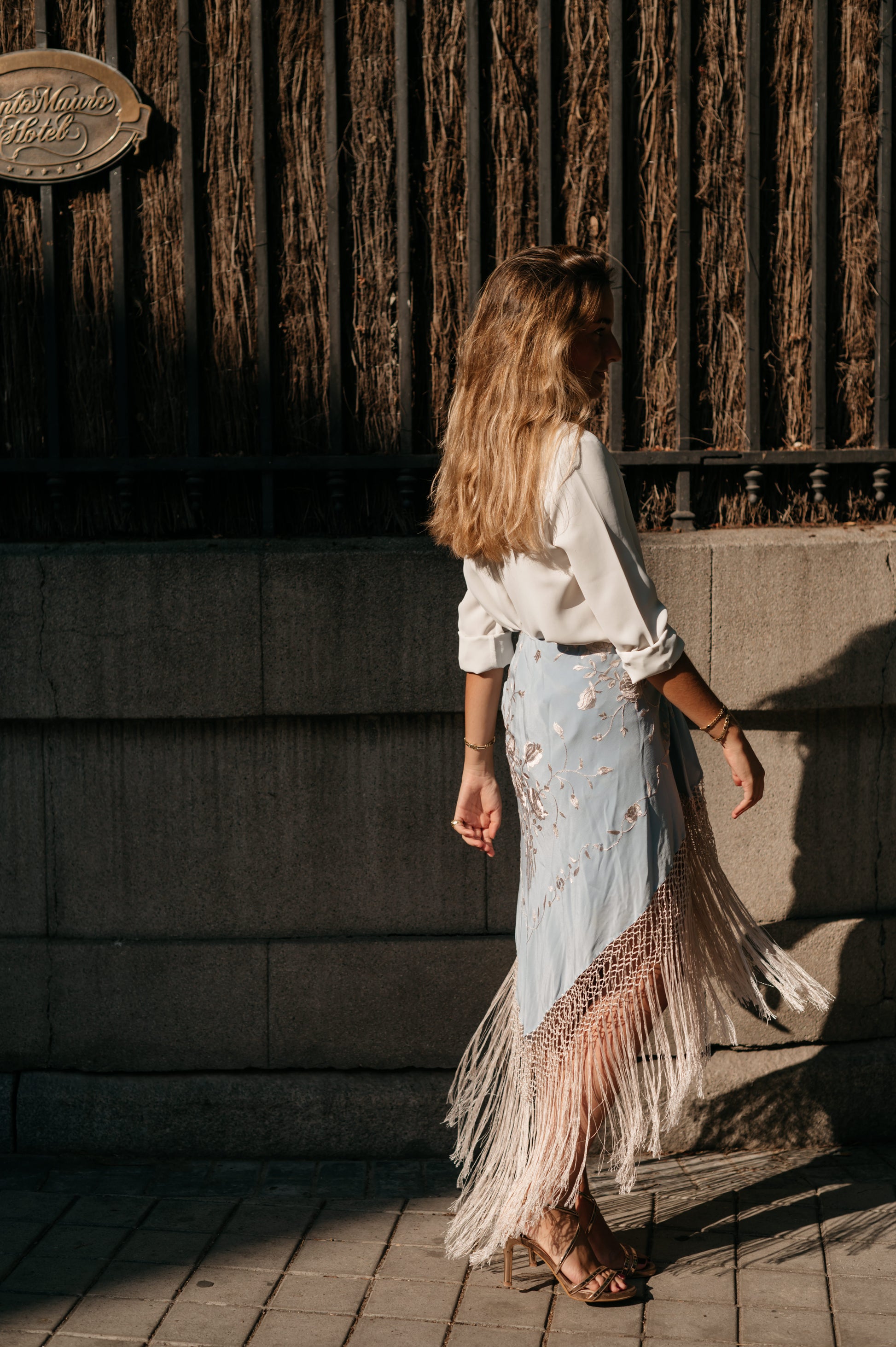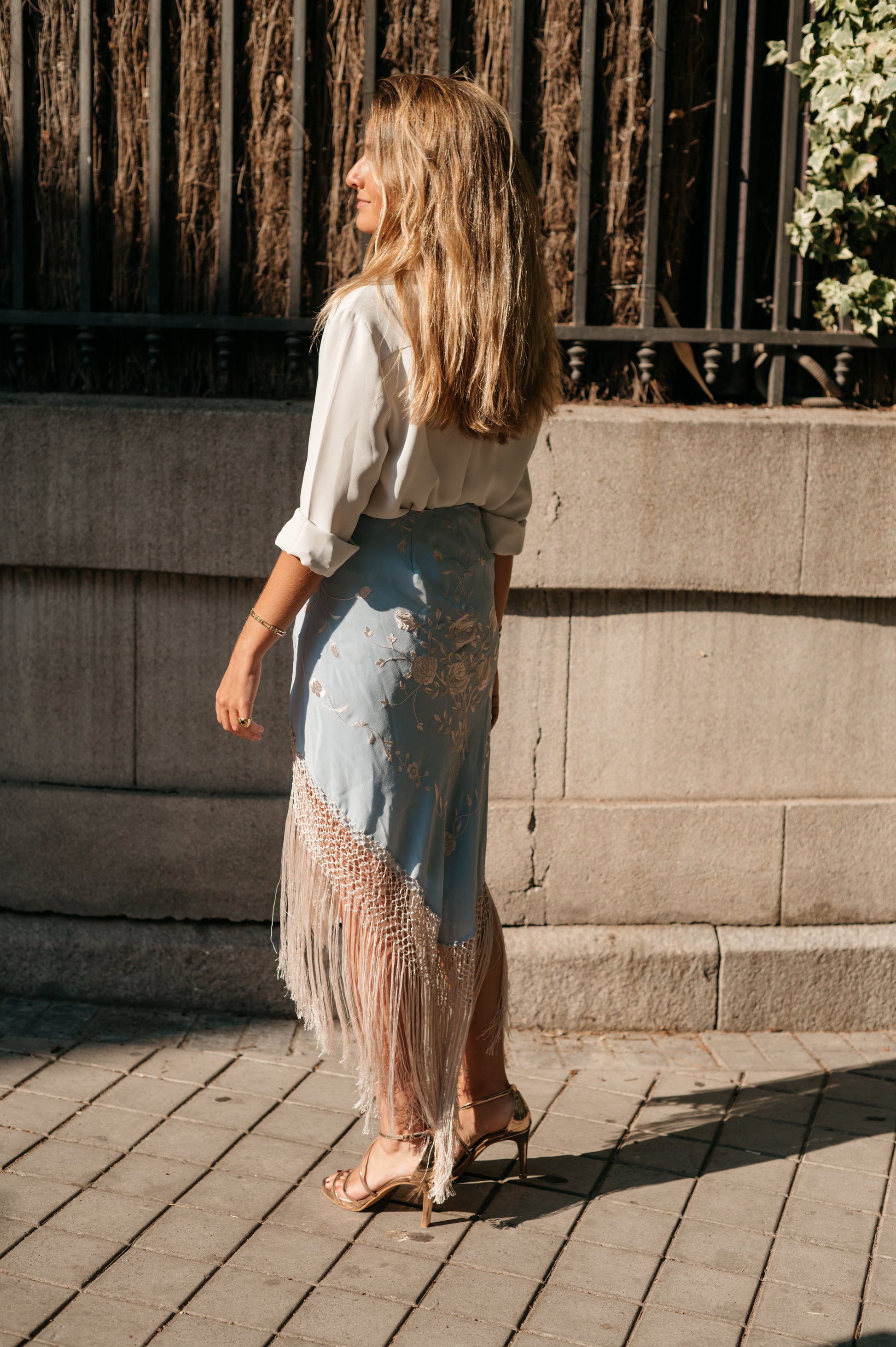 Falda pareo confeccionada con mantón de Manila bordado y flecado a mano, en seda celeste con flores y flecos beige. Se cierra con cremallera y corchete.