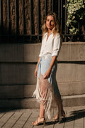 Si te gustan los tonos empolvados, esta falda es la tuya. La Jupe Celeste es una buena alternativa para celebraciones de día como bautizos y comuniones. Combinada con blusas y tops en color beige, marfil o crema es todo un acierto.