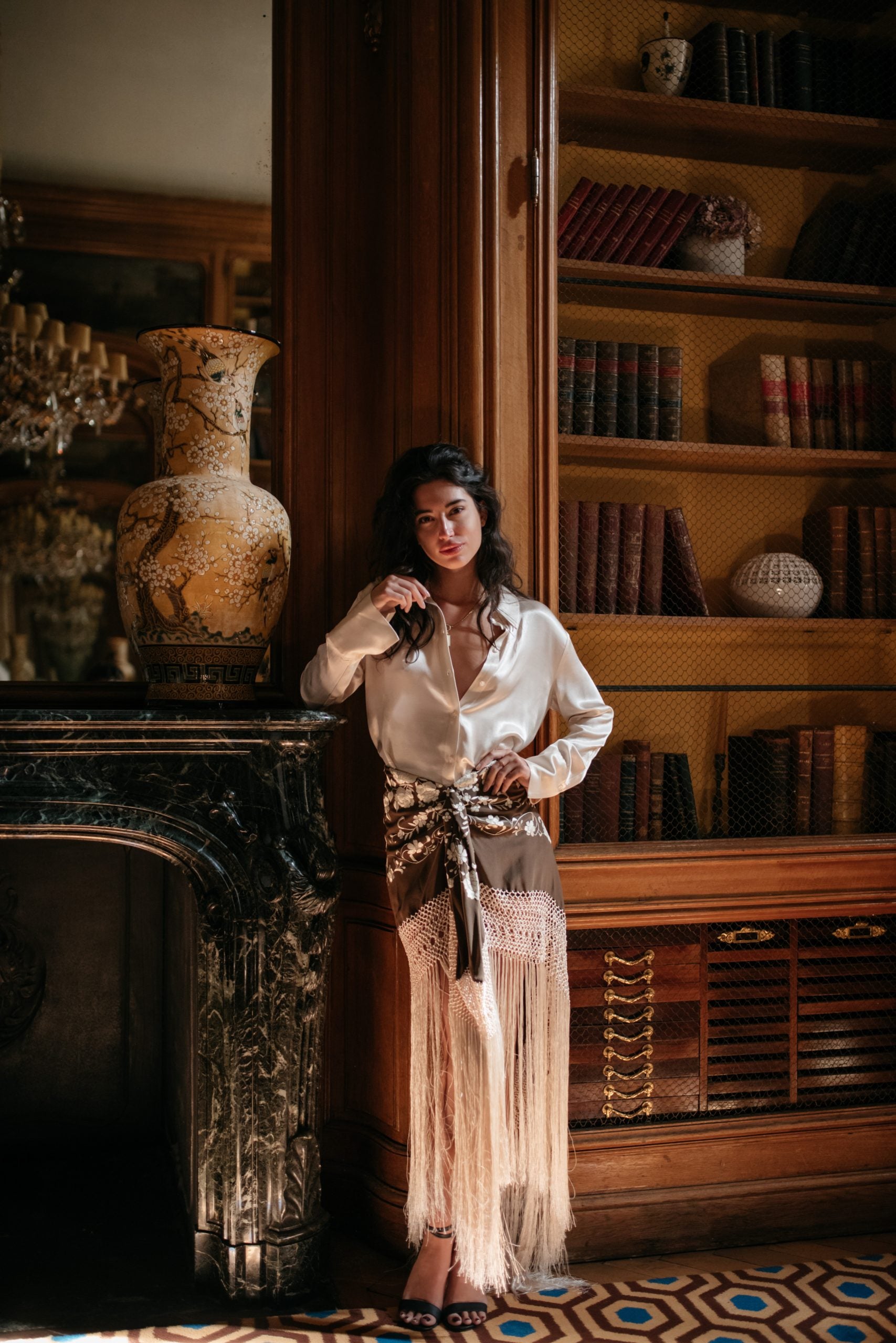 Nuestras faldas confeccionadas con mantones de Manila son un icono de la casa. En ROOM 717 reivindicamos este producto tan nuestro, el mantón de Manila, y lo llevamos a un terreno más actual y contemporáneo convirtiendo esta pieza de seda bordada y flecada a mano, en una falda pareo que puedes lucir en multitud de ocasiones, más allá de Ferias y eventos.