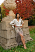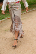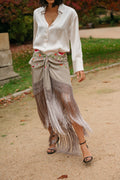 - Para que los flecos queden bien, basta con colgar la falda unos días antes de usarla y el fleco, al ser de seda, se estirará por sí solo.