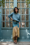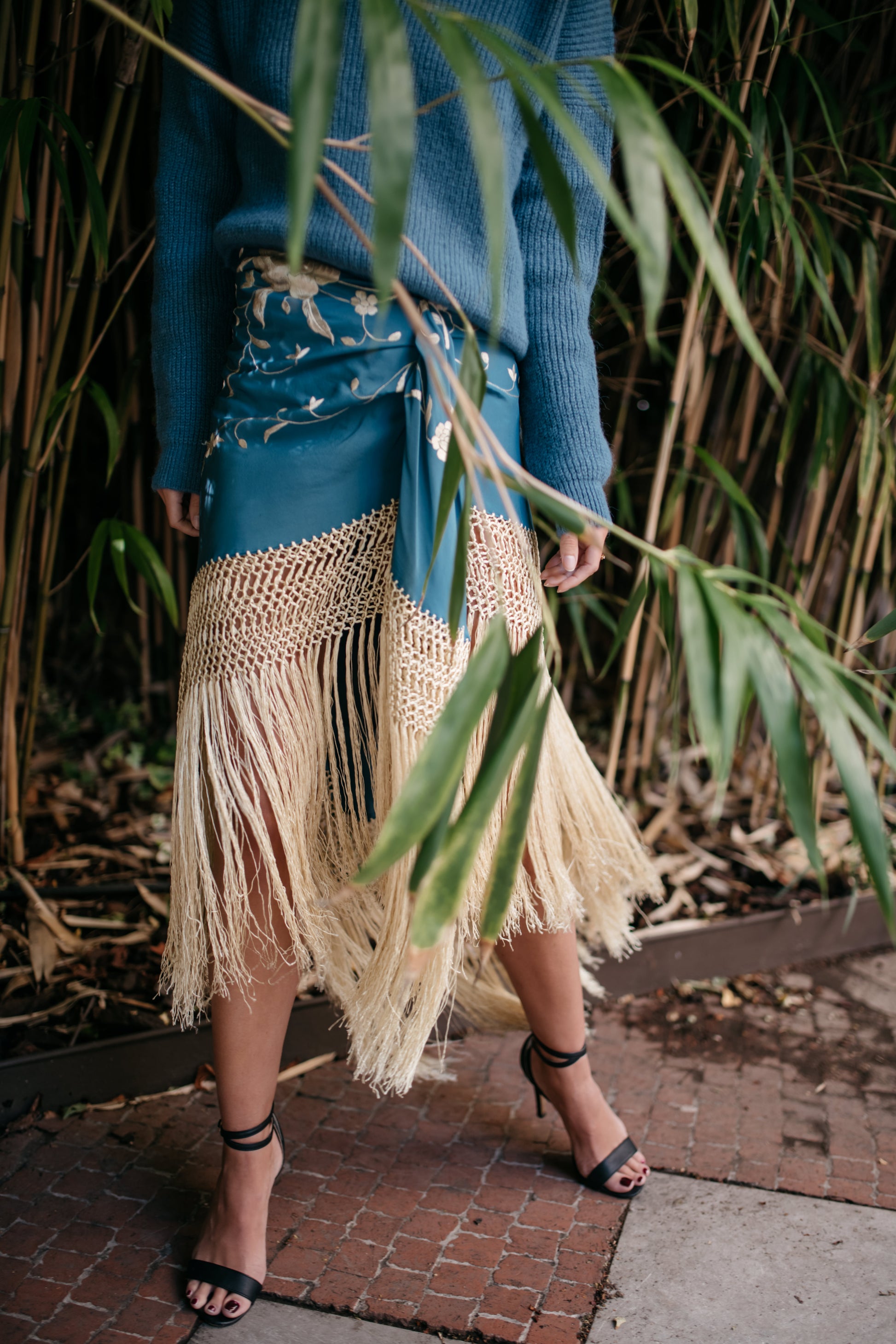 Falda pareo confeccionada con mantón de Manila bordado y flecado a mano, en seda azul con flores y flecos en oro. Se cierra con cremallera y corchete.