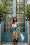 Una falda muy elegante para lucir una noche de Pescaíto o un día de boda. Por su tonalidad podrás lucirla tanto de día como de noche y su bordado en oro hace que quede genial con sandalias y accesorios dorados.