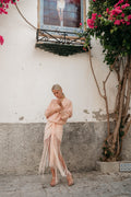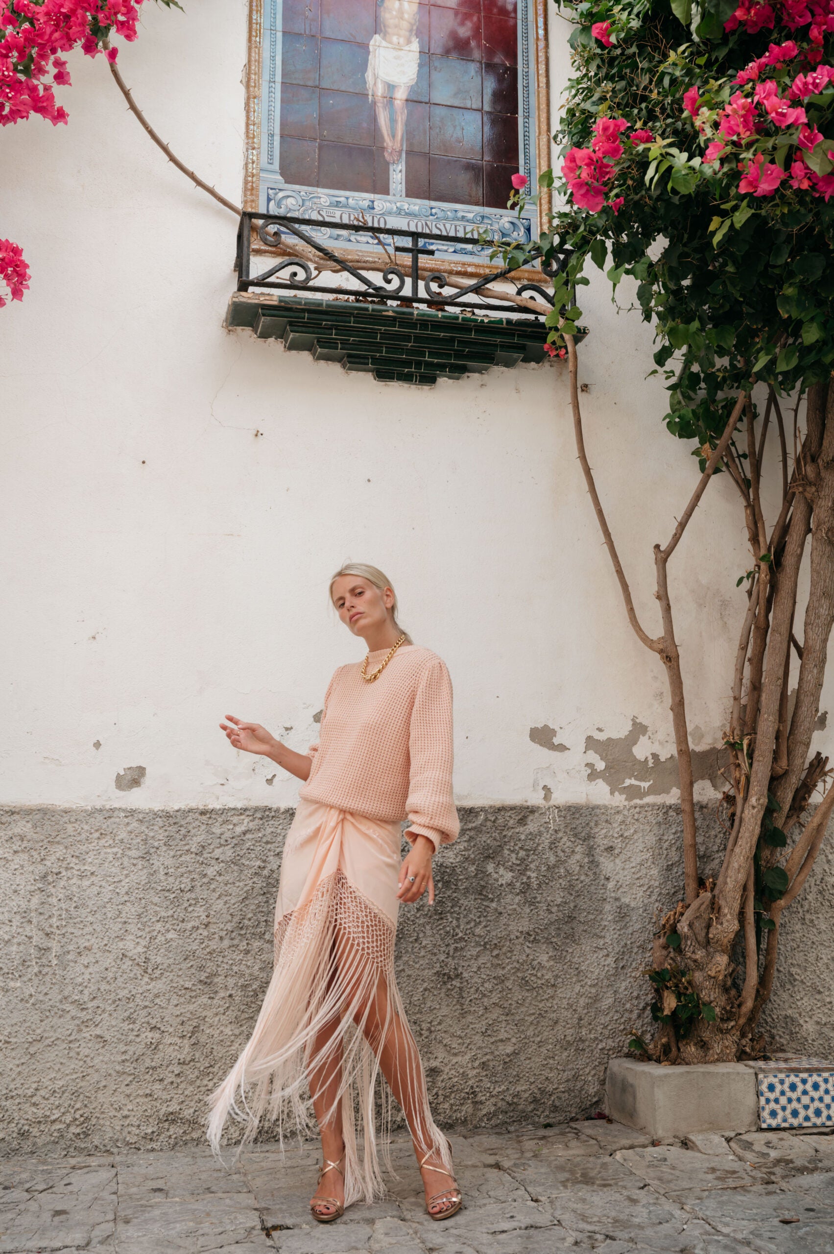 Falda pareo confeccionada con mantón de Manila bordado y flecado a mano, en seda rosa empolvado con flores y flecos a tono. Se cierra con cremallera y corchete.