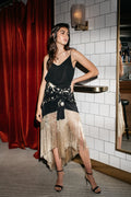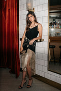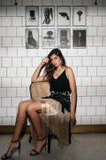 ¿Tienes un evento de noche? Esta falda en seda negra es perfecta para cenas y cóctels nocturnos. Combínala con una camisa satinada, un lencero negro o un top dorado a tono con sus espectaculares flecos.