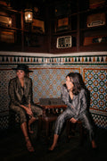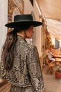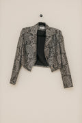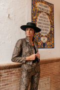 Chaqueta torera con estampado jacquard oro y negro. Tejido ligero, no se arruga.