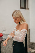 Top con manguitos y escote corazón palabra de honor. Tejido de encaje rígido y botones de estilo antiguo