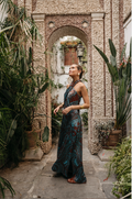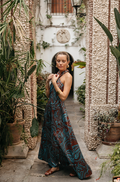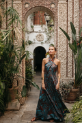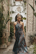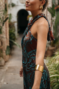 Vestido largo con escote halter anudado al cuello, corte en la cintura y falda de capa. Tejido italiano ligero en estampado paisley marrón y turquesa ligeramente satinado. Falda de capa con movimiento. No se arruga.
