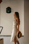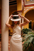 Lúcelo para una tarde de Feria, con sombrero a tono o un canotier, o llévalo por la noche con grandes pendientes y un mantón de Manila. Los lunares son sinónimo de Feria pero en un tejido delicado como este suponen una opción sutil y elegante. Su favorecedor escote halter permite lucir hombros y espalda bronceada de la manera más sofisticada. ¡Serás la reina de la noche!